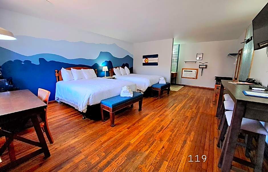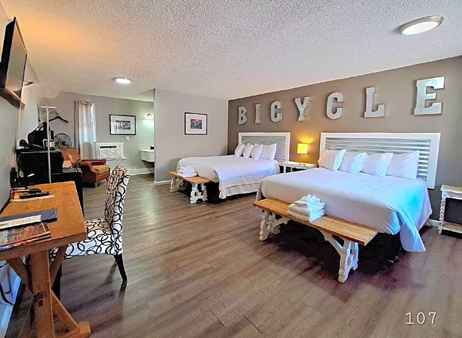 2 queen beds in a room with a mini fridge, mini microwave and Keurig coffee maker, air conditioner/heater unit, cable flatscreen TV. Bathroom with shower over tub. Hair dryer and clothes iron available upon request. Please note that we do have three rooms that have a shower only (no tub). Smoking, vaping and pets are not allowed.