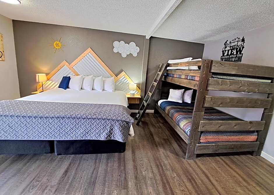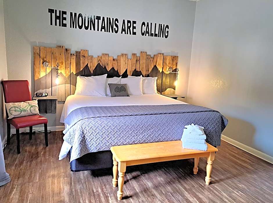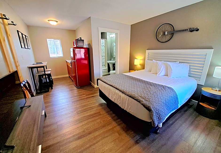 Room with 1 king bed featuring a mini refrigerator, mini microwave, and Keurig coffee maker, air conditioner/heater unit, cable flatscreen TV. Bathroom with shower over tub. Hair dryer and clothes iron available upon request. Please note that we do have one king room that has a shower only (no tub). Smoking, vaping, and pets are not allowed.