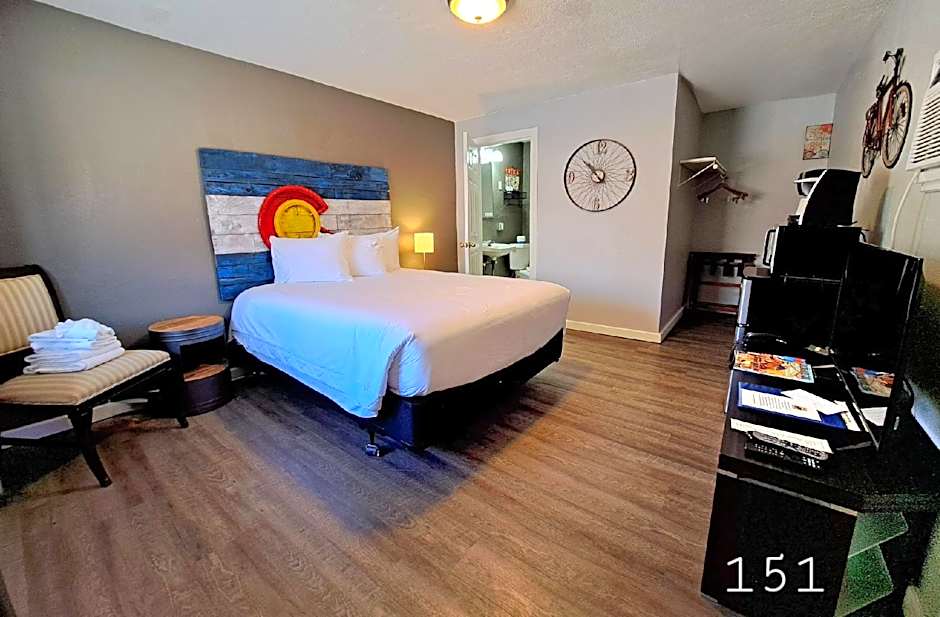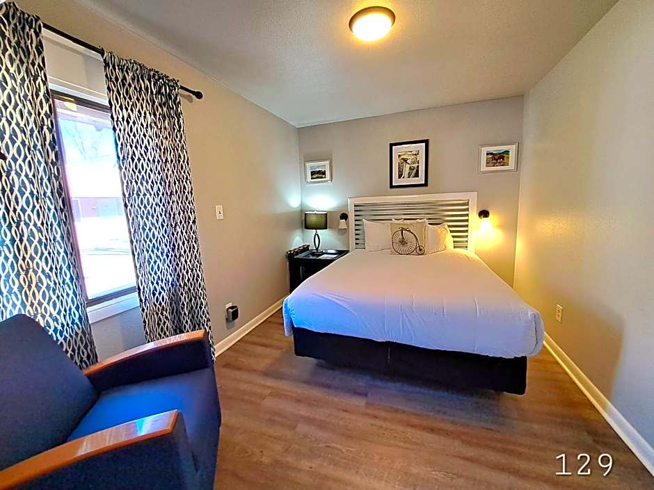 1 queen bed in a room with a mini fridge, mini microwave and Keurig coffee maker, air conditioner/heater unit, cable flatscreen TV. Bathroom with shower over tub. Hair dryer and clothes iron available upon request. Please note that we do have one queen room that has a shower only (no tub). Smoking, vaping and pets are not allowed.